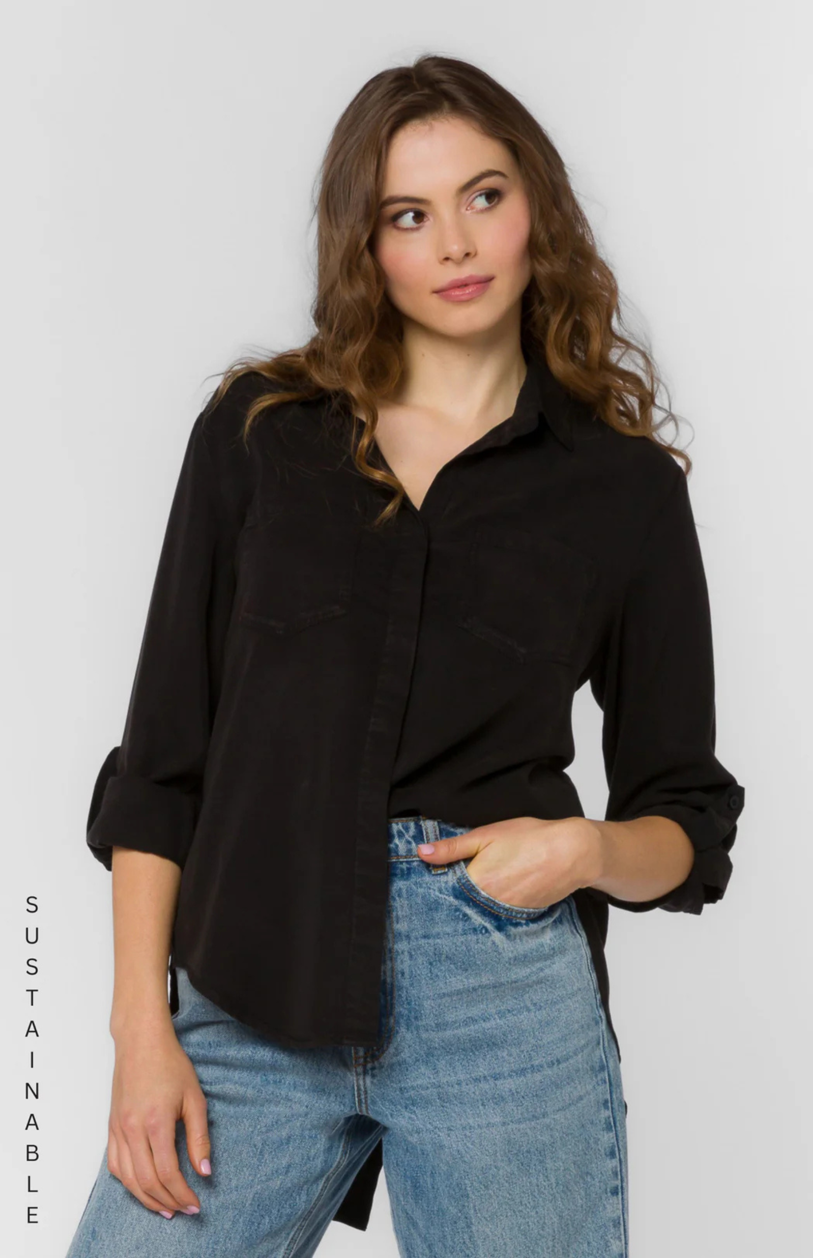 This button up shirt features rolled tab sleeves, chest patch pockets, and a split-back tail. Crafted from 100% TENCEL™ lyocell that is soft to the touch with a smooth, fluid drape.