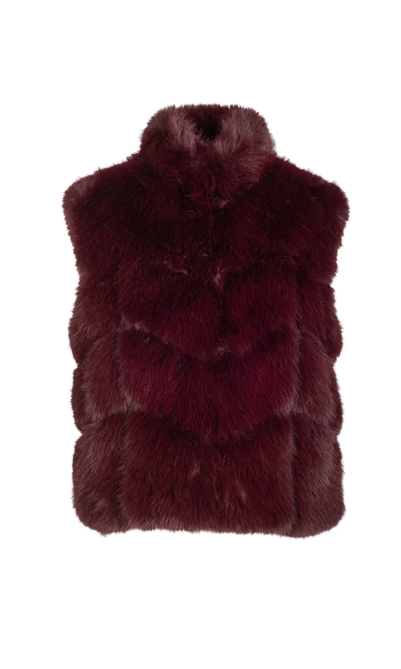 Elevate your fall layers with the Rosario Faux Fur Vest in Cabernet. Featuring chevron paneled faux fur, a high neckline, and a cropped silhouette, this plush vest makes a bold statement while keeping you cozy. Style it over a fitted knit or layered atop a dress for instant cold-weather glam.