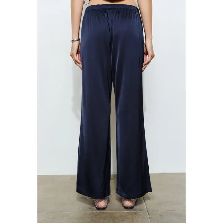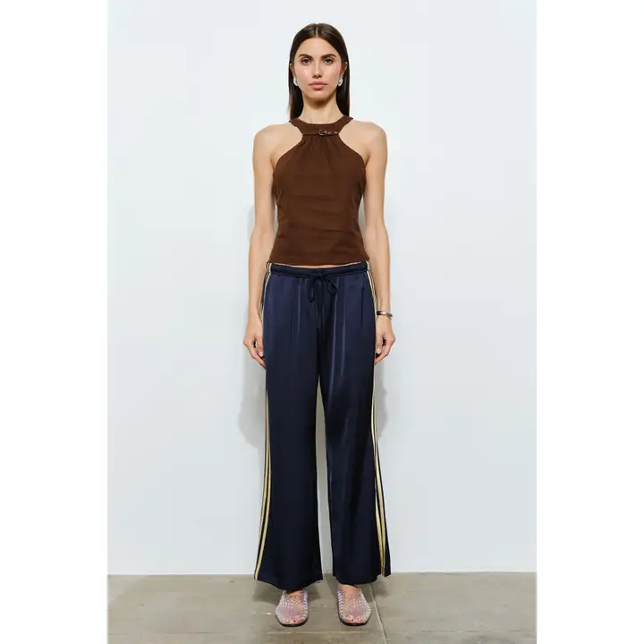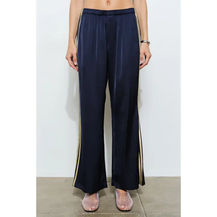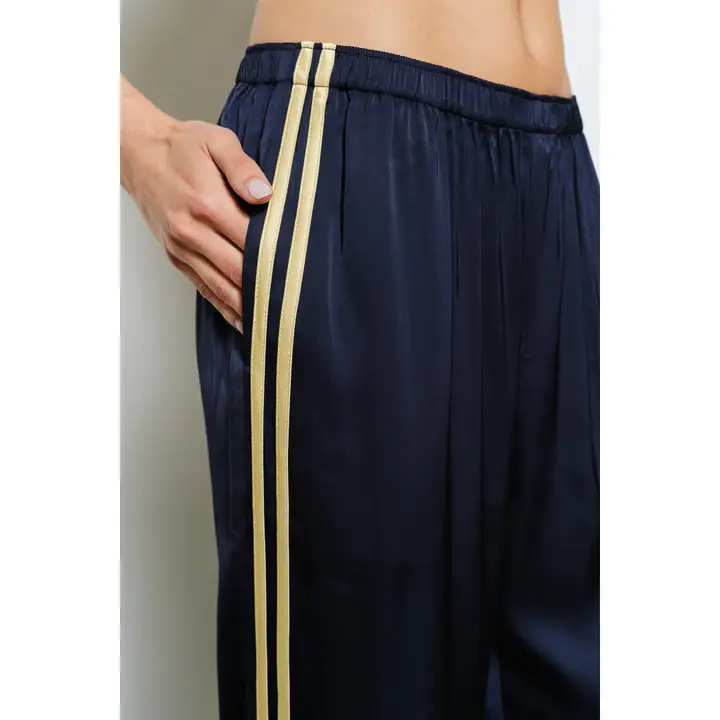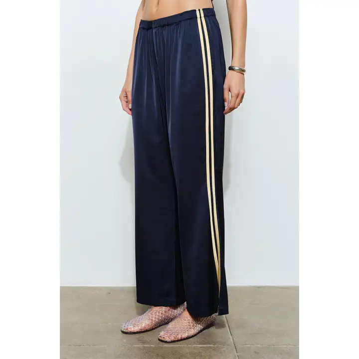 The Sandy pants elevate a classic track-pant silhouette with fluid, luxe satin. A contrasting double stripe runs down the side, adding a sporty yet sophisticated detail to the relaxed, wide-leg cut. Features an elastic waistband w/ adjustable ties and side seam pockets.