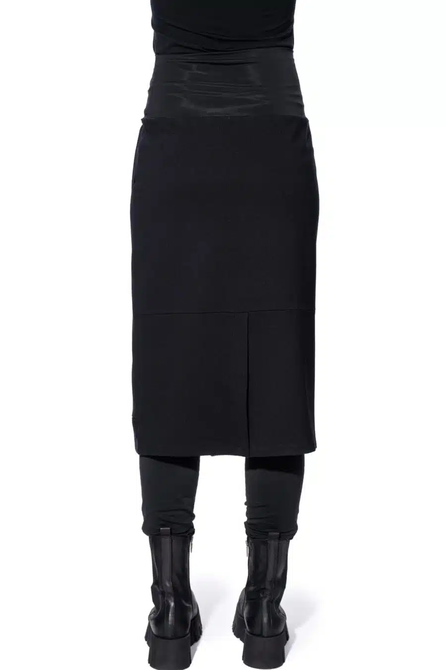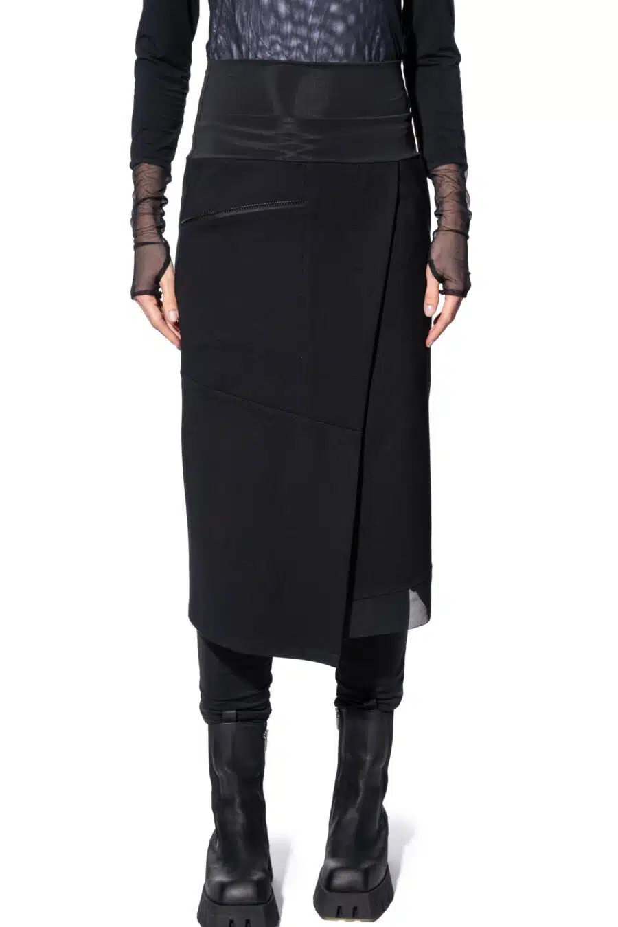 This straight-cut skirt features a modern mix of materials and refined details. A zip pocket on one side and a classic French pocket on the other combine style and practicality. The mesh hem adds subtle transparency, while the back slit ensures ease of movement. The elastic jersey waistband provides ultimate comfort.