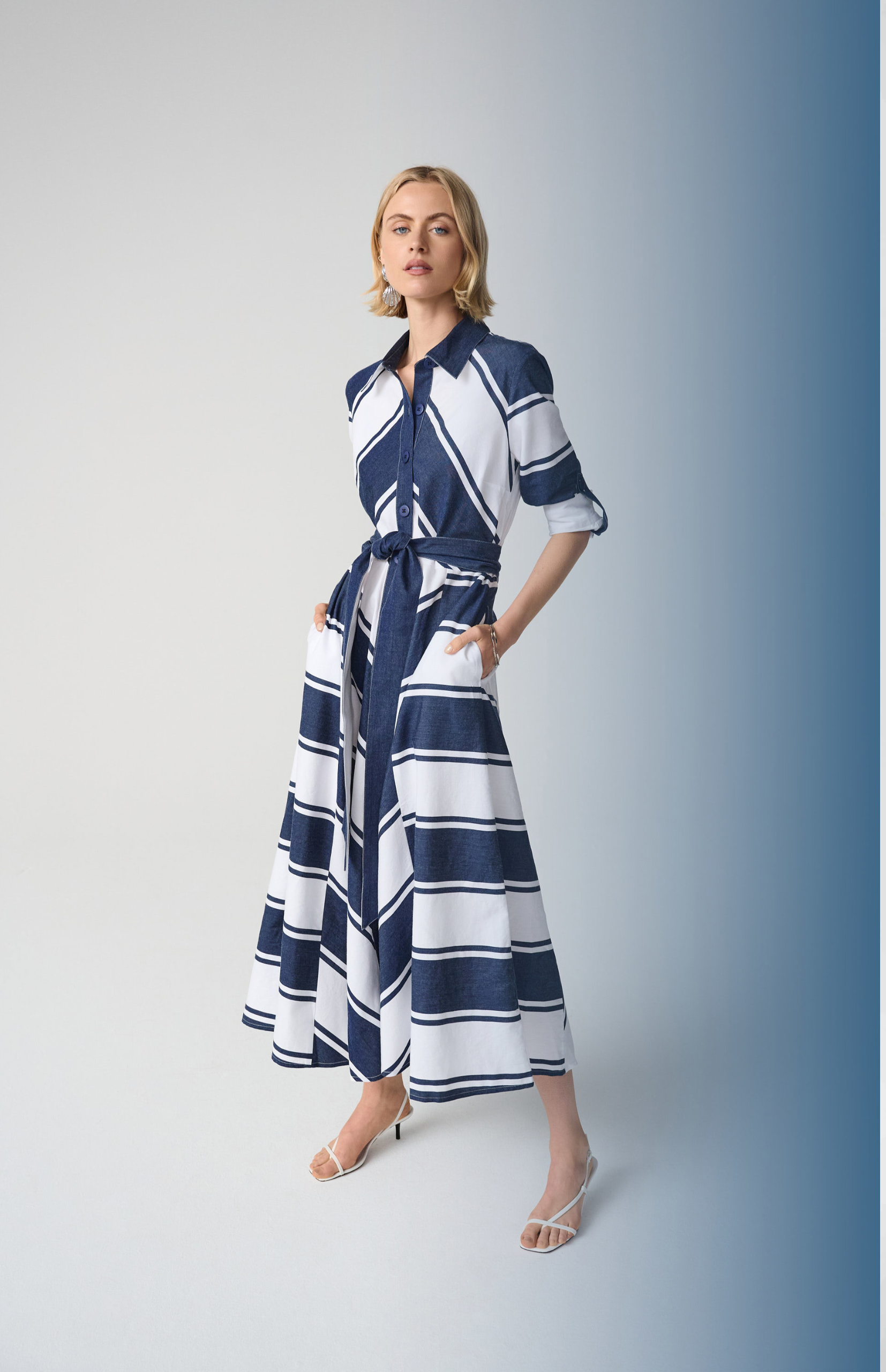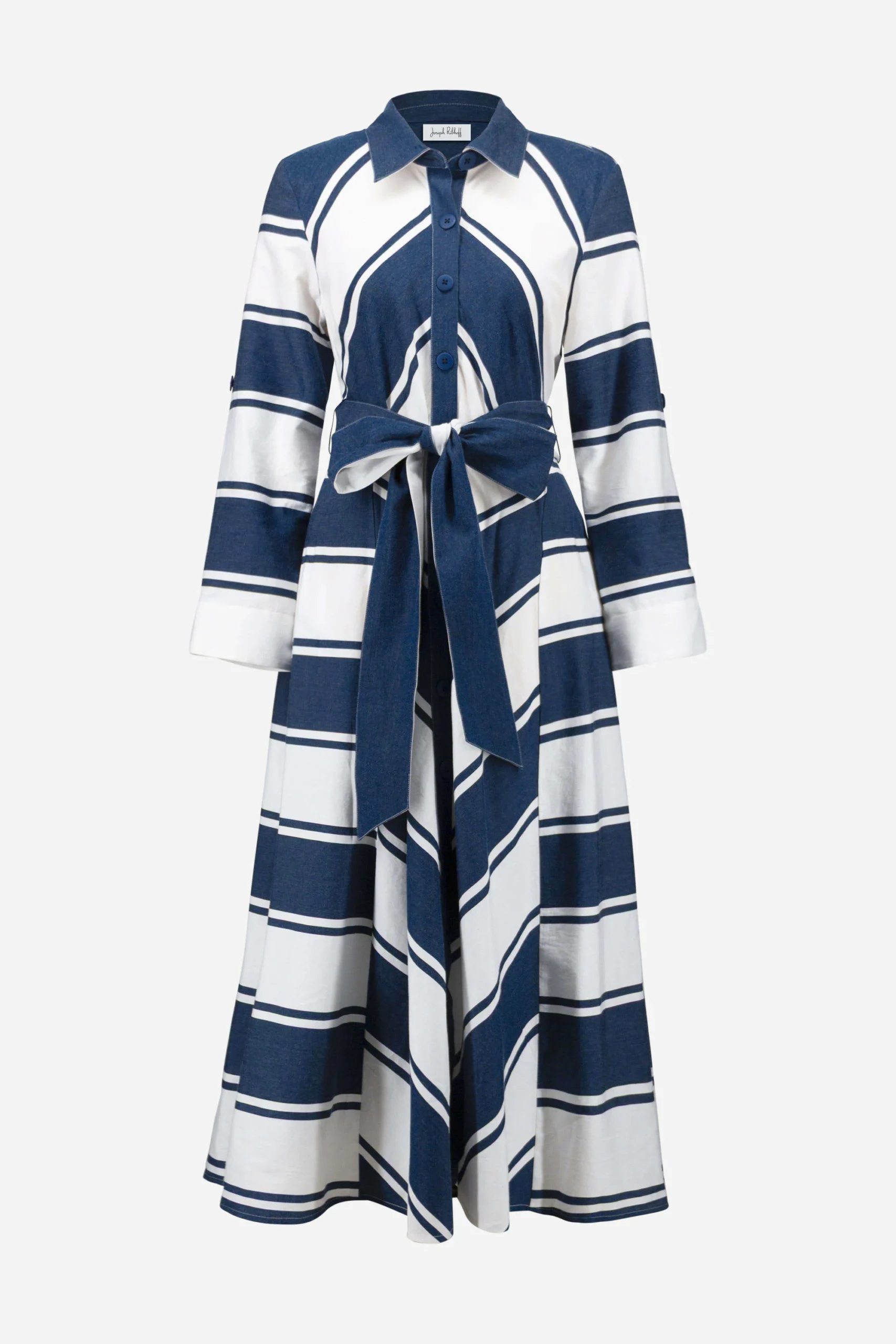 This stripe cotton shirt dress features a classic shirt collar and front placket with buttons. Three-quarter sleeves with tabs and a reversible solid sash at the waist add versatility, while the midi length completes the look.