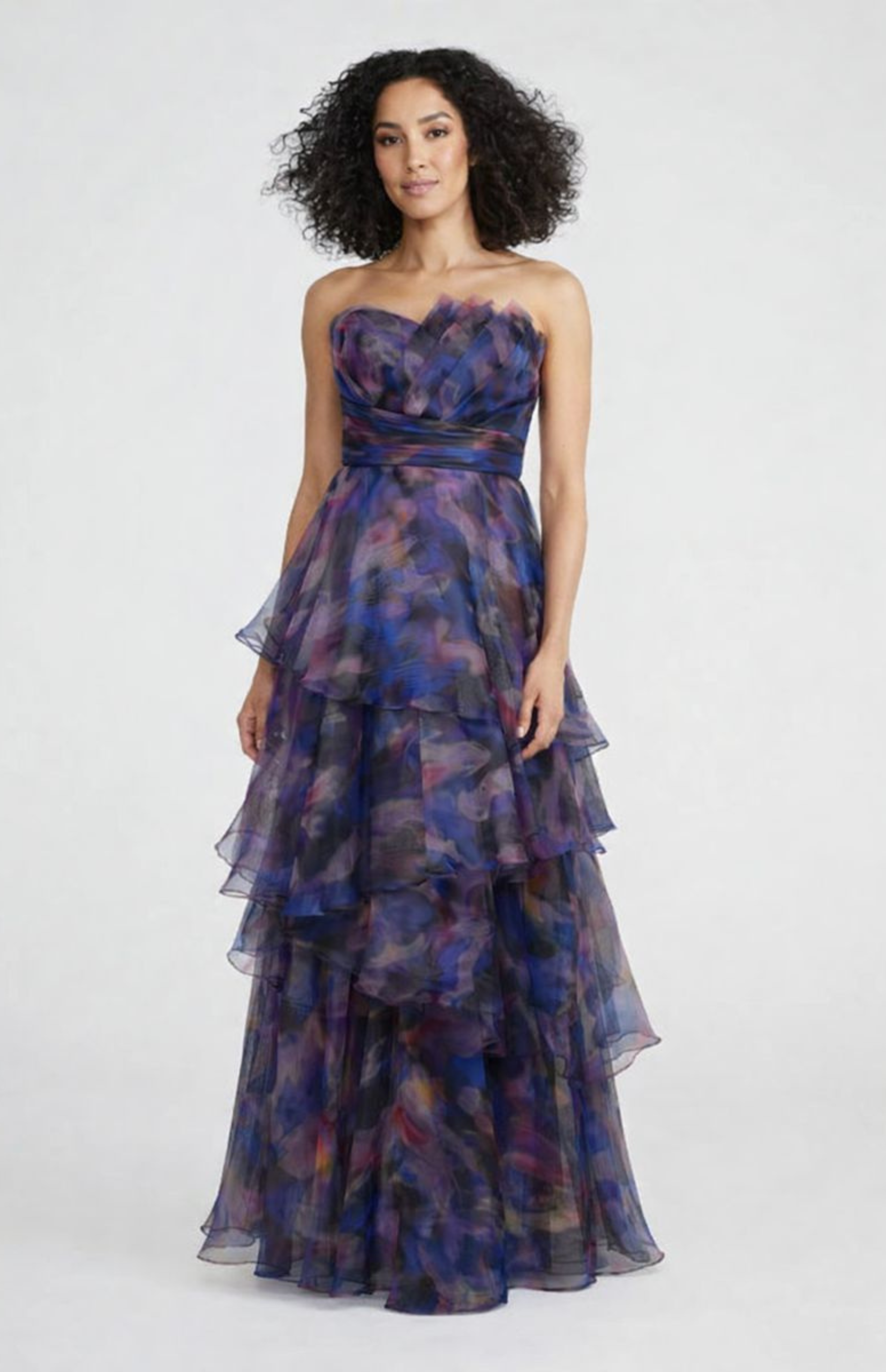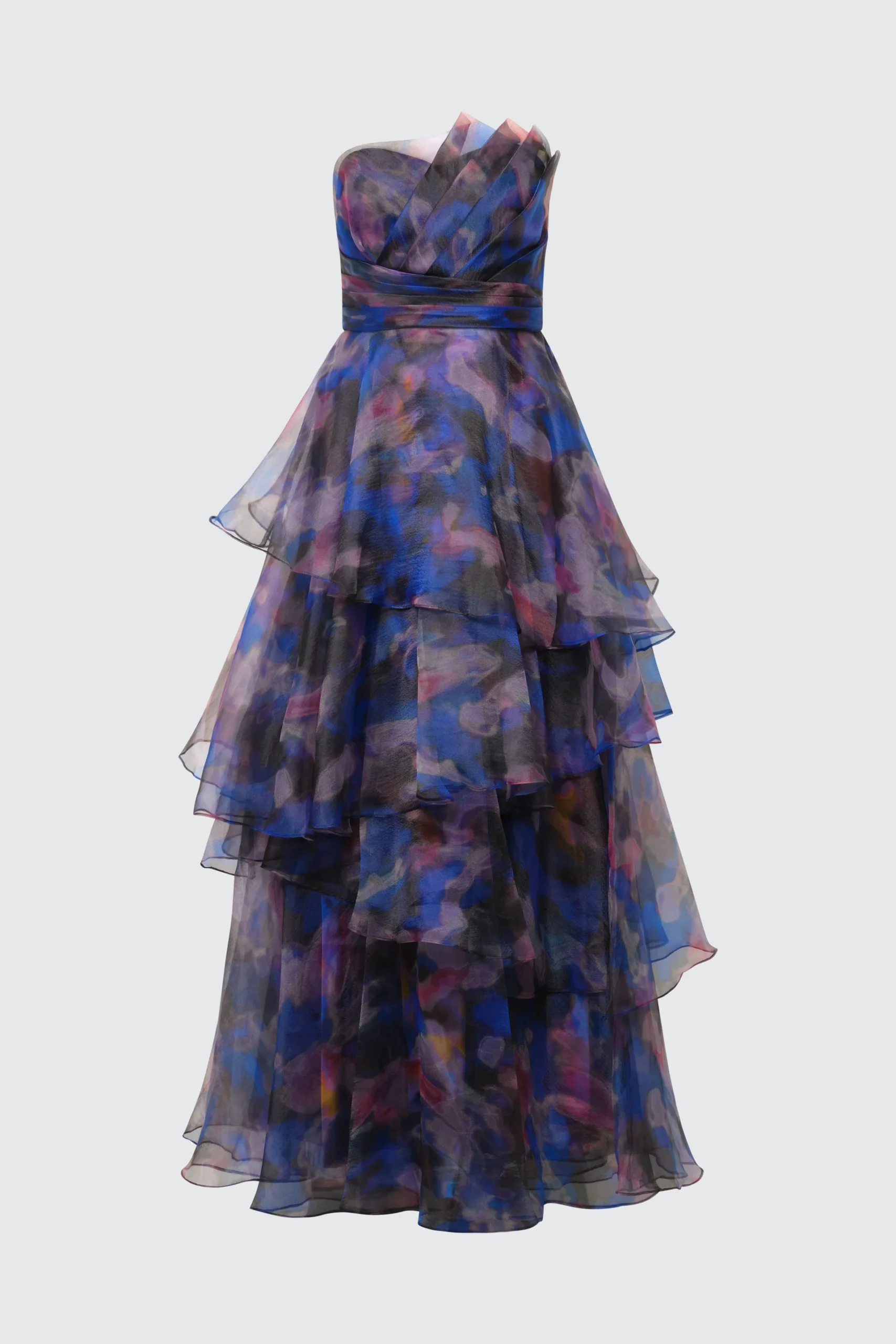 Strapless gown crafted from tiered pebbled organza with an abstract play of shadowed jewel tones. A voluminous, romantic silhouette designed for weddings or black-tie occasions.