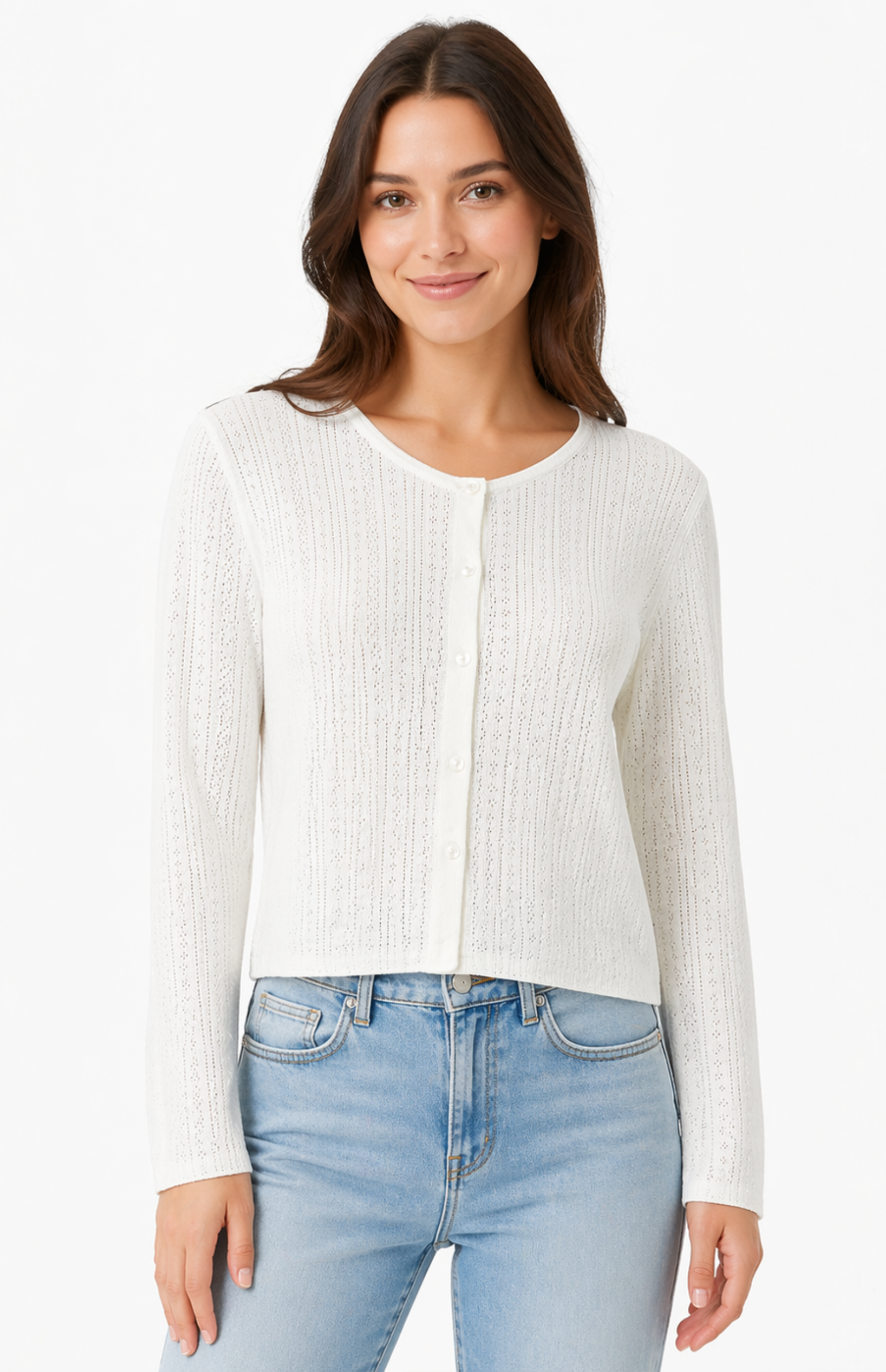 A refined everyday essential, this lightweight knit cardigan is designed with a delicate pointelle texture that adds subtle femininity and breathability. The soft ivory tone makes it endlessly versatile, while the fitted silhouette offers a clean, polished look.