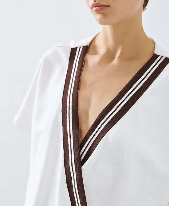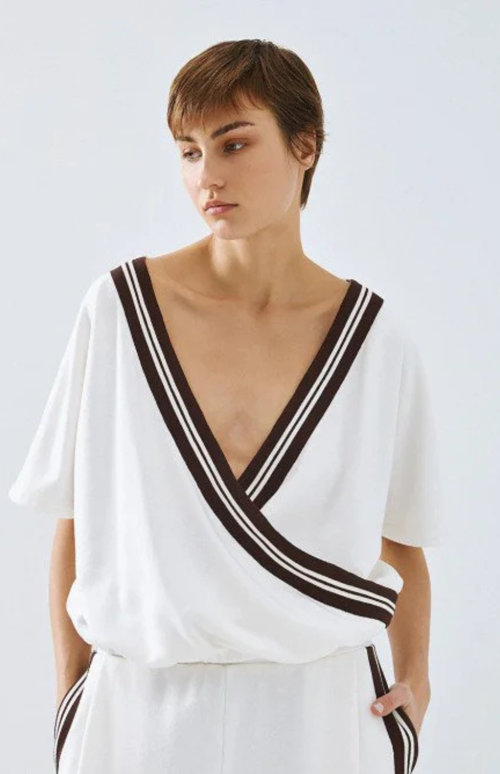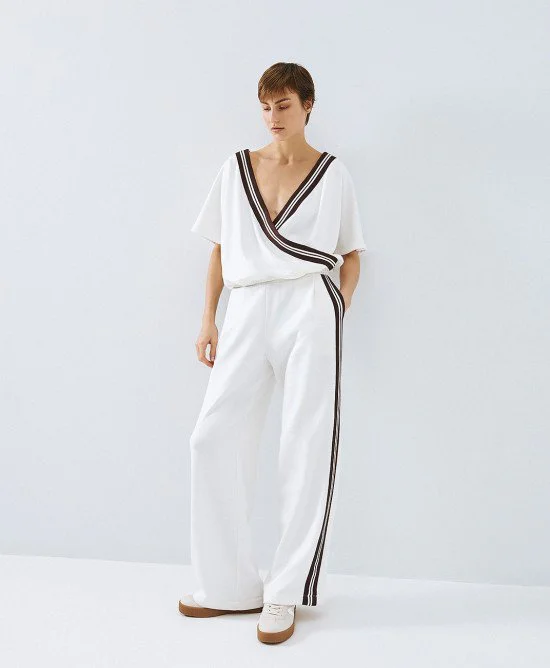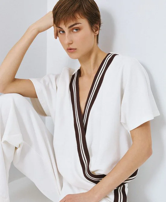hort-sleeve sweatshirt top with a wrap neckline, striped trim, and an elastic hem. Pair it with the matching sweatshirt pants from our collection.