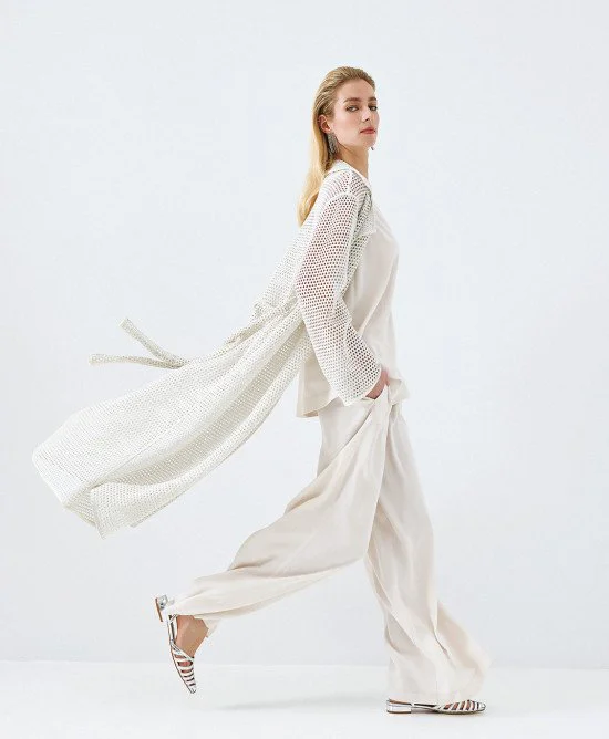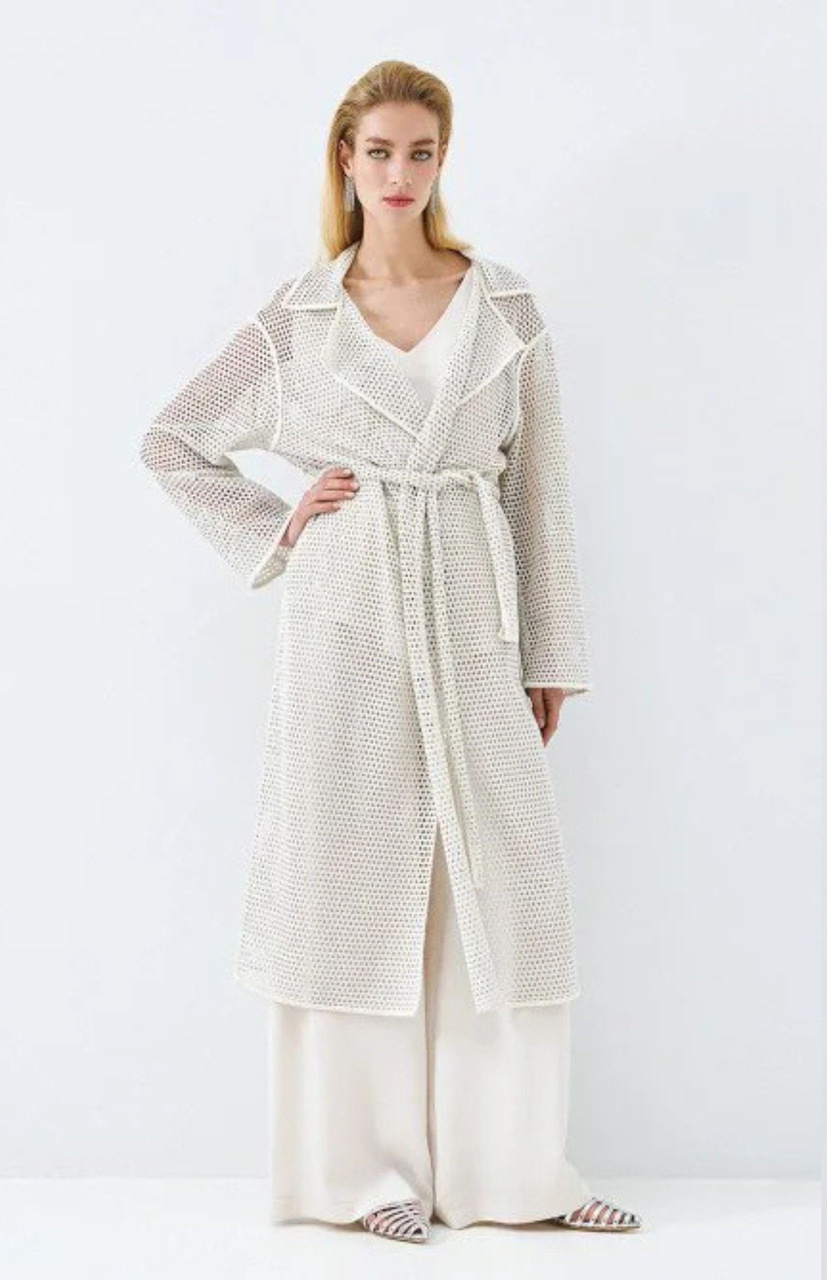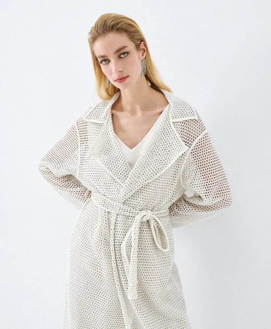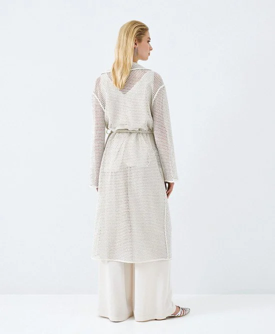 Perforated knit trench coat with a lapel collar and long sleeves. Features lurex details, belt loops and a removable tie belt.