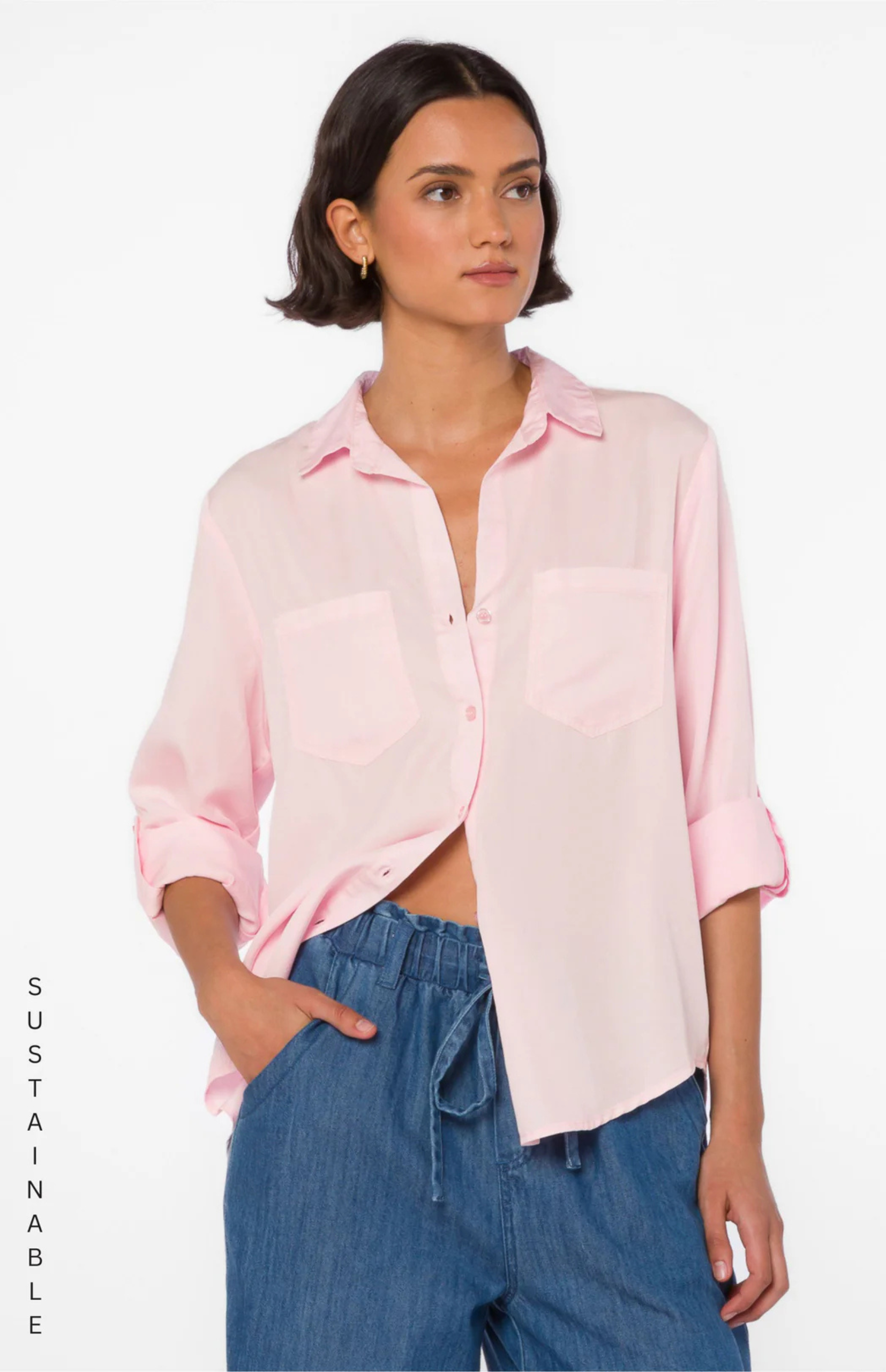 This rolled tab sleeve shirt features a classic button-front, chest patch pockets, rounded high-low hem and a light weight feel.