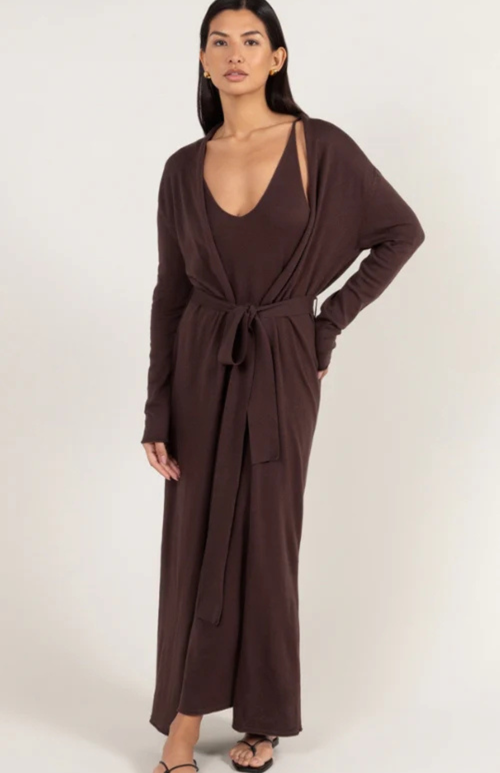 Discover Sofia Maxi Cardigan, knitted in fine gauge viscose. The perfect cover up to add to your look – or get a polished co-ord look with matching slip dress. Wear with matching belt closure for styling versatility. Light weight knit makes it a perfect seasonal style solution.