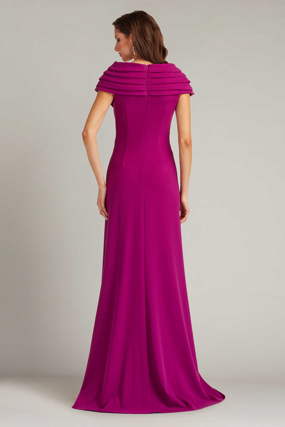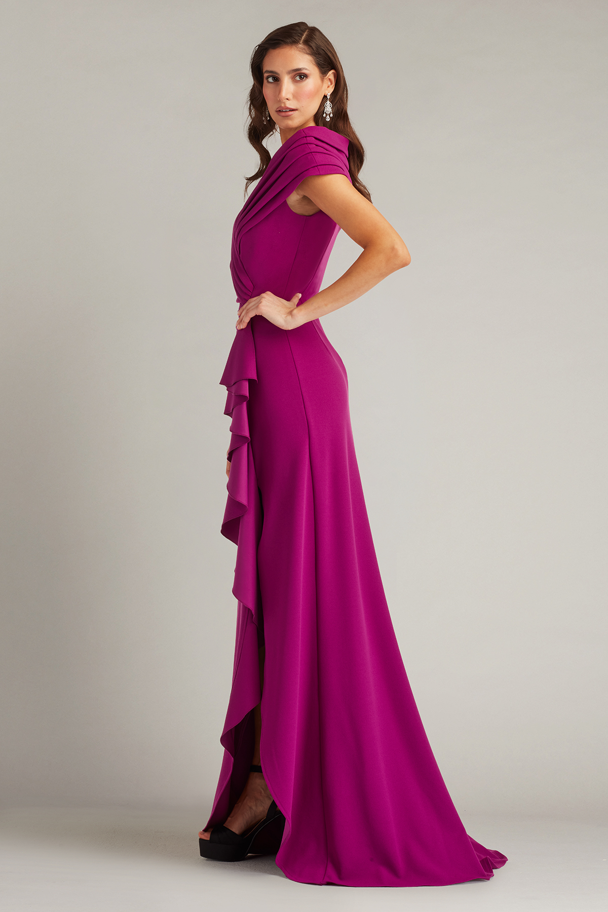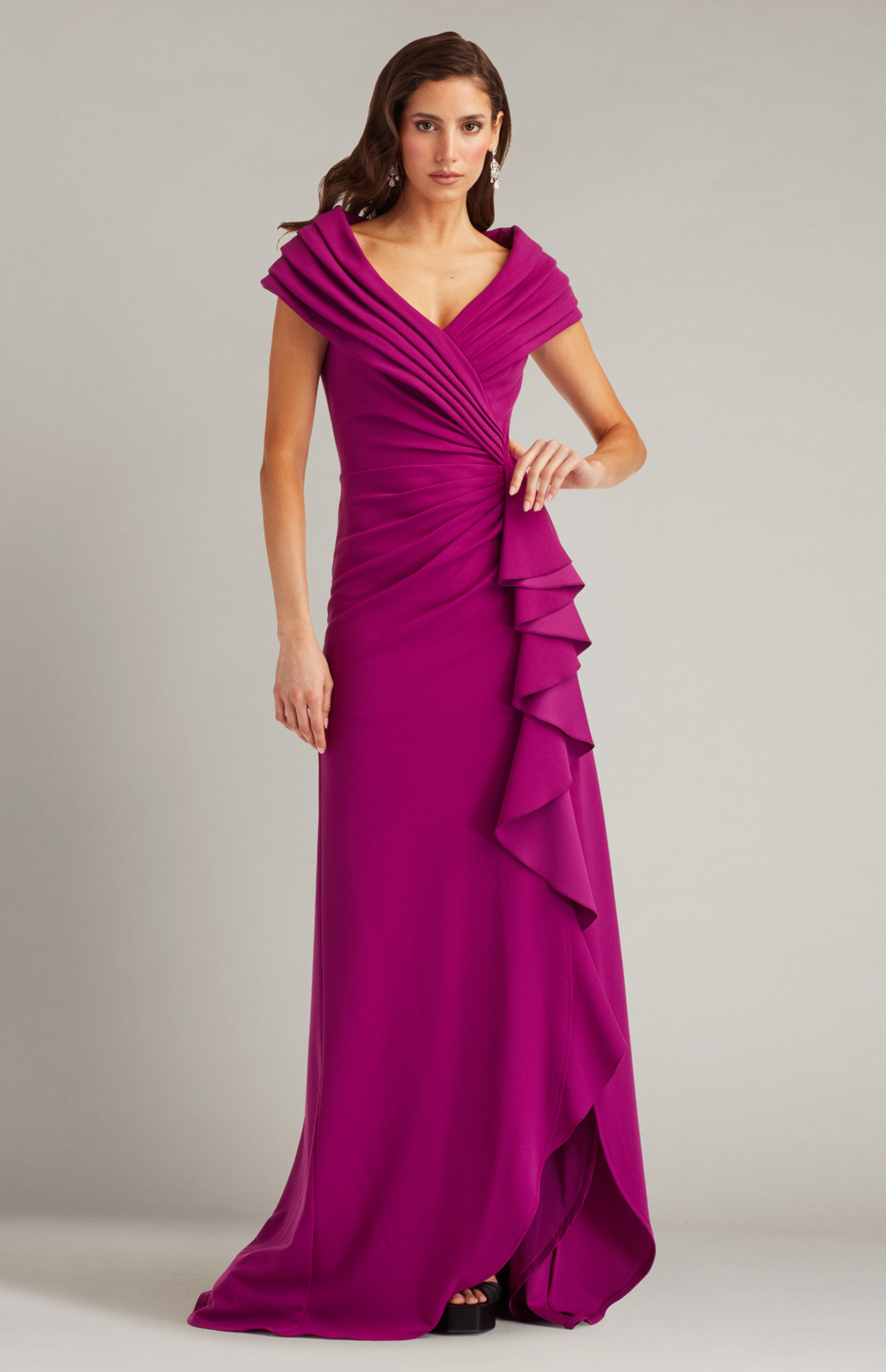 This gown is crafted from luxurious crepe fabric featuring a flattering V-neckline and a pleated portrait collar that gracefully frames the shoulders. The fitted silhouette is enhanced by a side waterfall ruffle that cascades down into a high side slit adding a dramatic touch of movement and sophistication to the design. Concealed back zip.