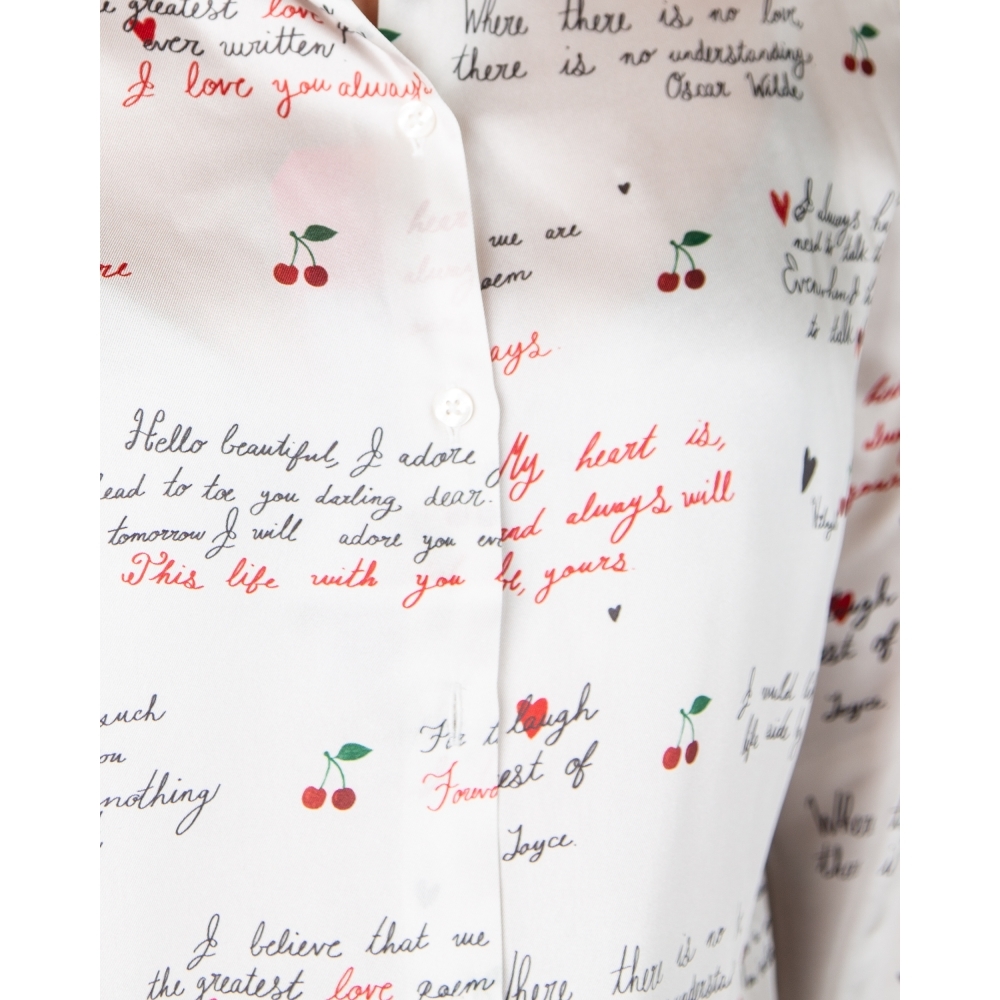 White straight-cut shirt with an original print of handwritten love phrases and small cherries scattered throughout the fabric. Classic shirt collar, visible button closure, and plain cuffs. The fabric is soft and fluid with a smooth finish.