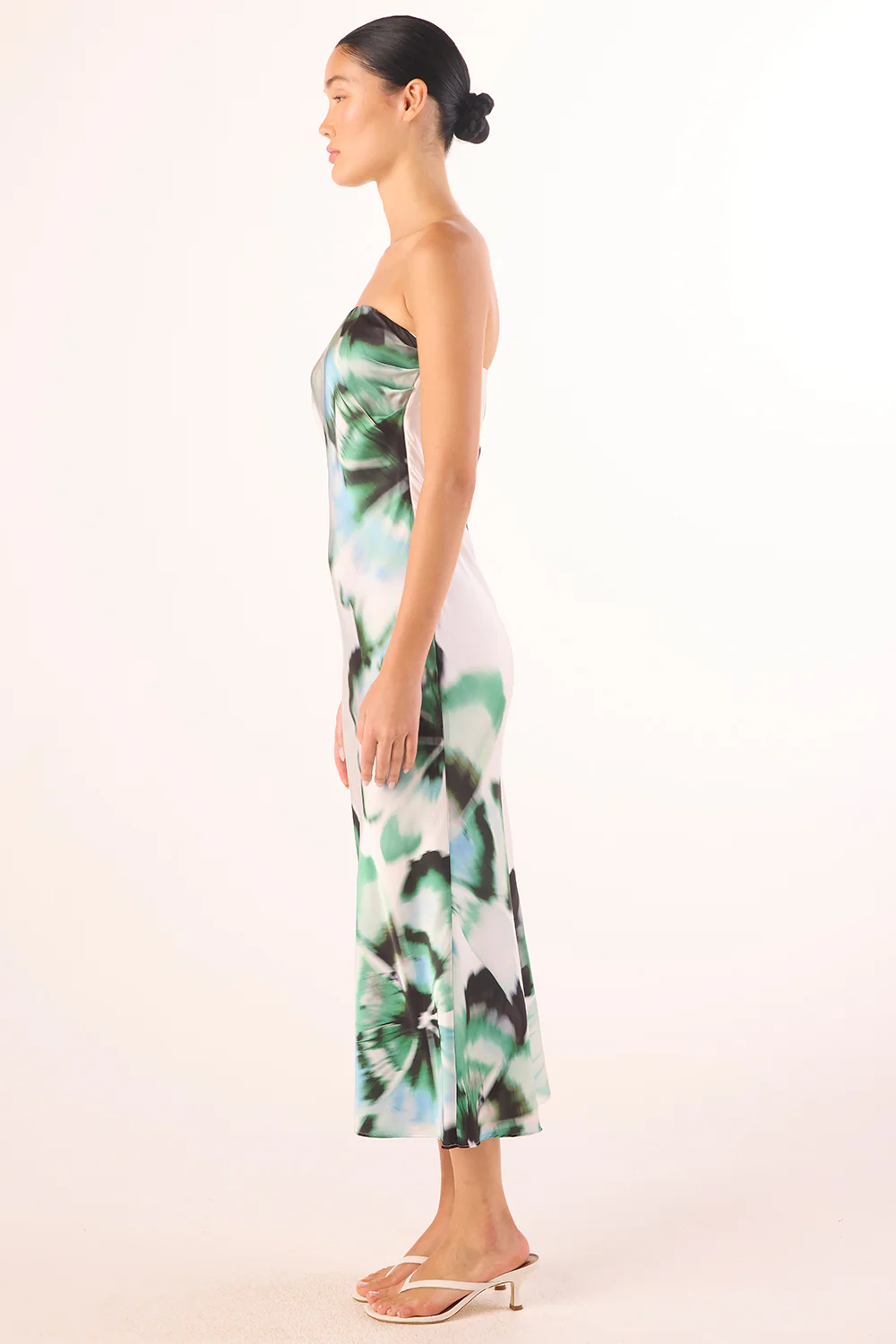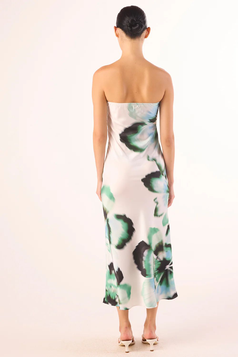 Thara is an ultra-chic strapless midi slip dress cut from our beautiful verdant anemone print satin. Cut on the bias with slight ruching at the bust with a hidden side zip closure. Dress up with your favorite heels or pair down with the perfect flat sandals.