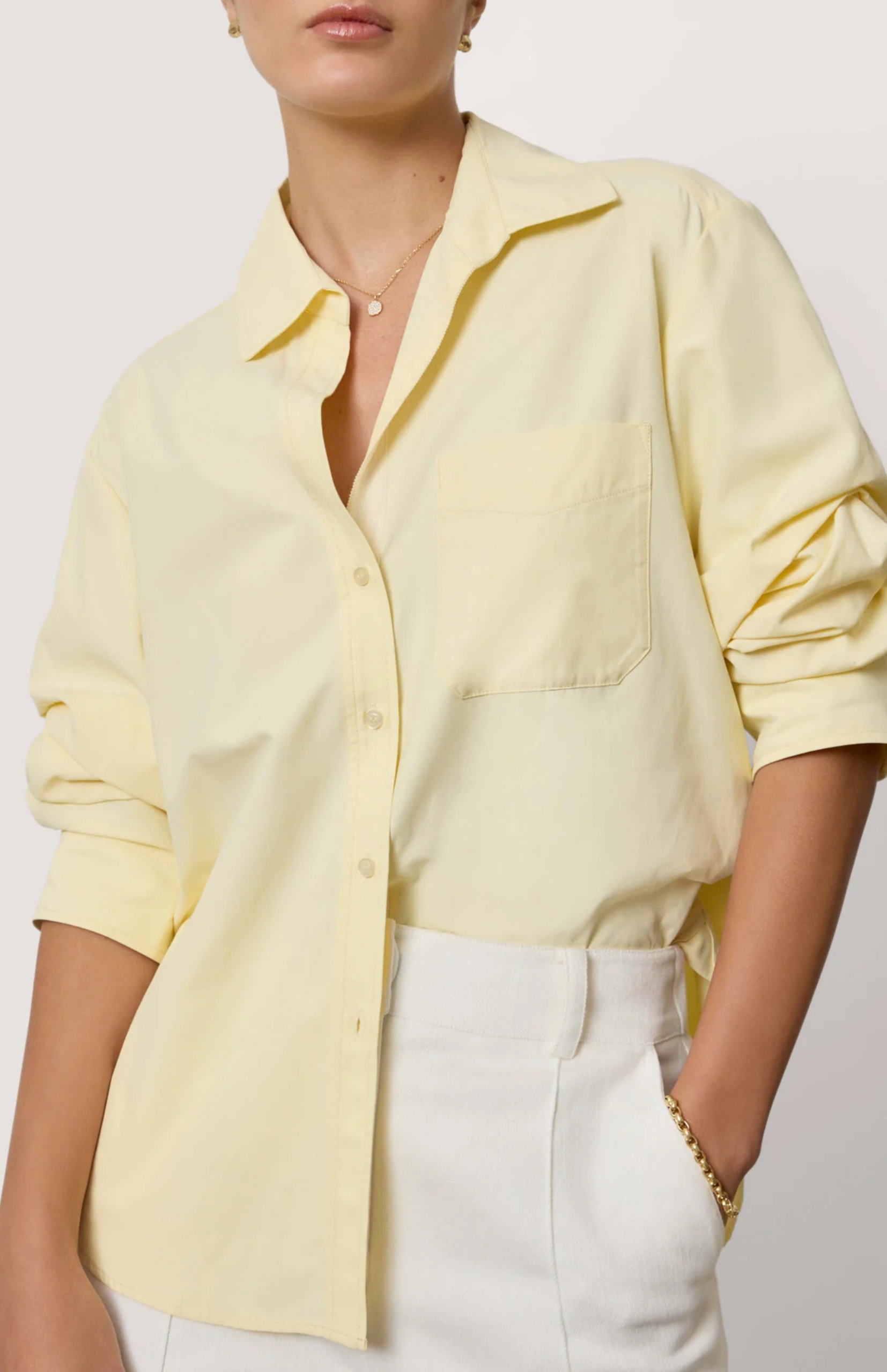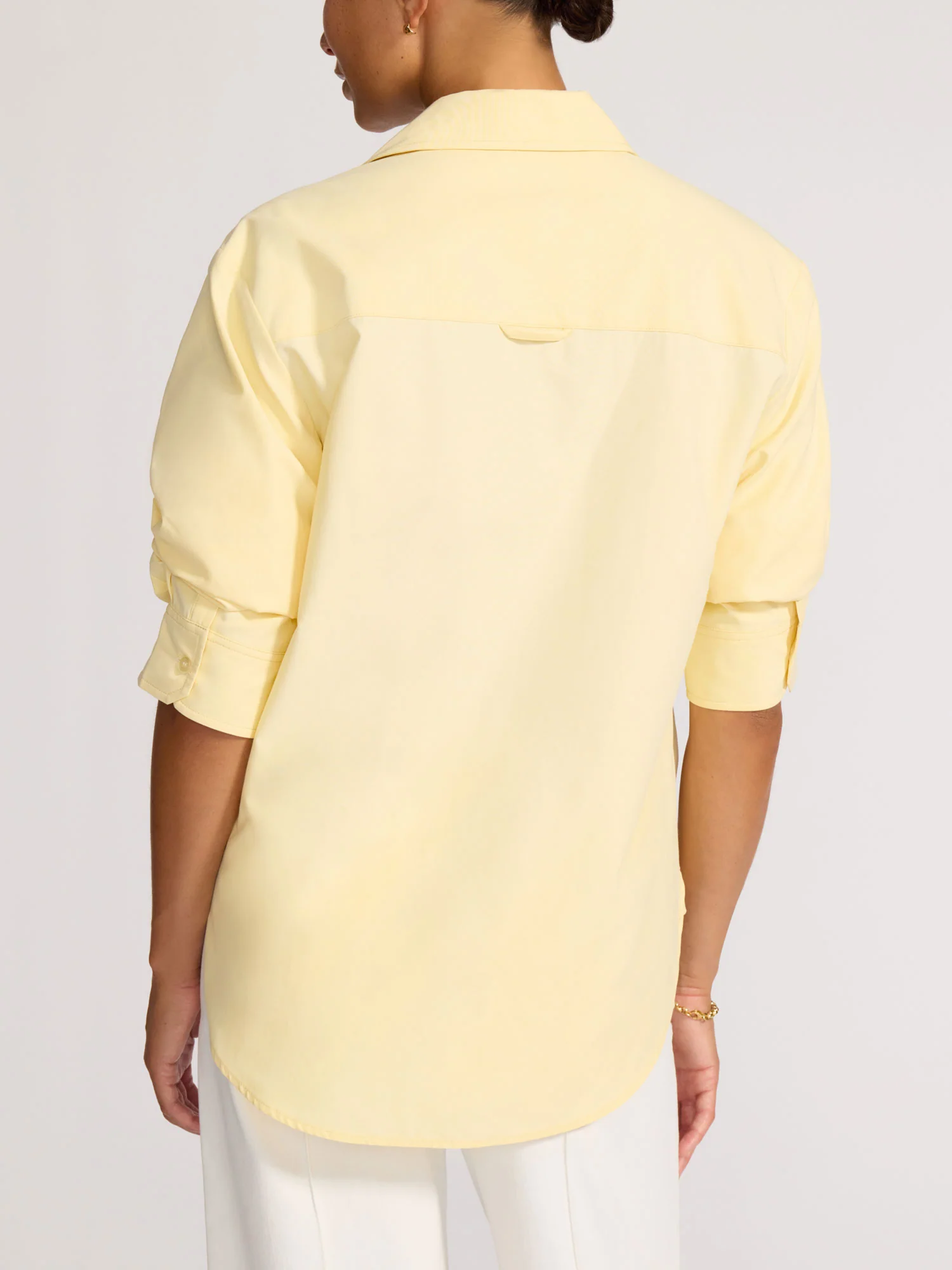 The newest addition to our iconic Shirt Collection , now reimagined with pre-styled, ruched sleeves for an on-the-go sensibility. With its relaxed, modern drape, it’s that effortlessly cool piece that goes wherever you go—striking the perfect balance of ease and chic. Thoughtful details, including a refined grosgrain-trimmed placket and signature locker loop, elevate this button-front style.