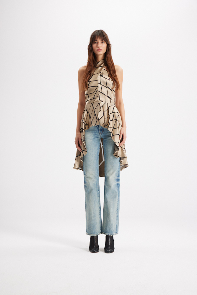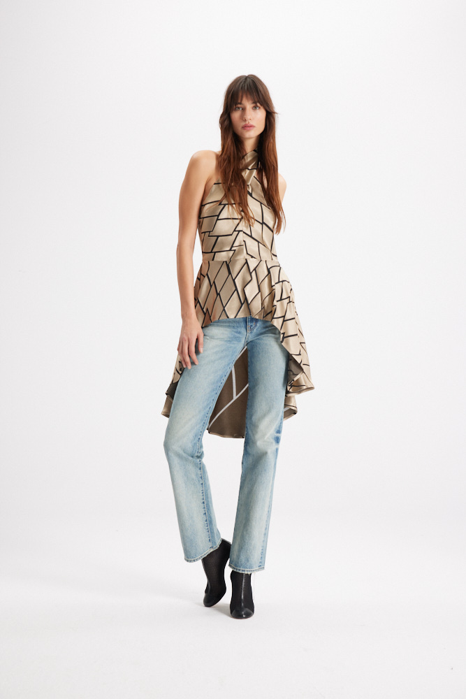 Elevate your look with the striking Theia Top, designed to turn heads. Crafted from a luxe satin-like fabric, this halter-neck silhouette features an asymmetric hemline and a bold geometric pattern that blends elegance with edge. The draped neckline adds a refined touch, while the flowing cut creates effortless movement. Pair it with denim for a chic daytime look or dress it up with tailored trousers for evening sophistication.