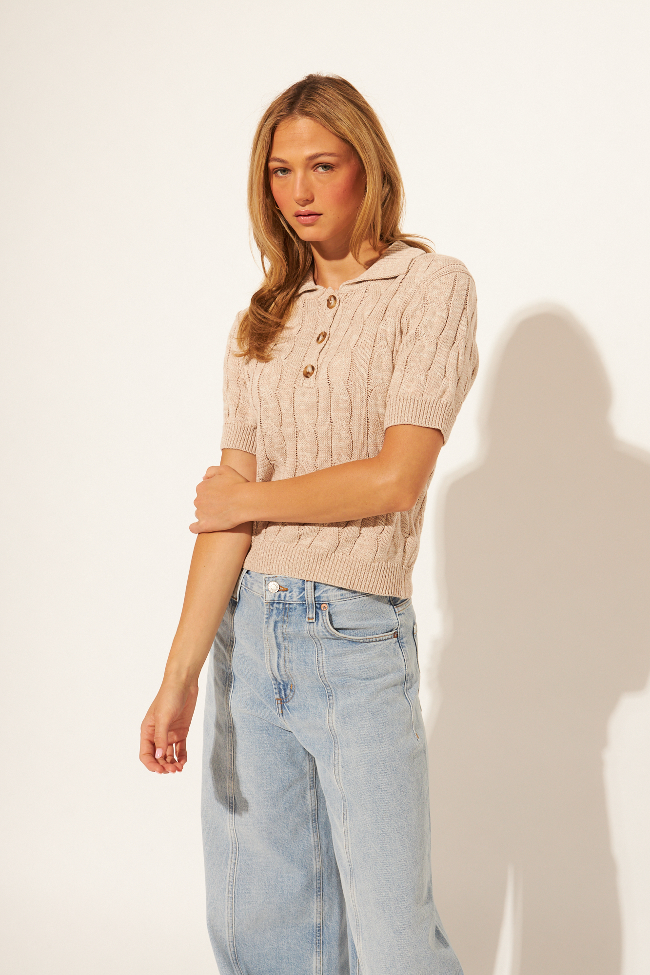 Cable knit short sleeve polo sweater.