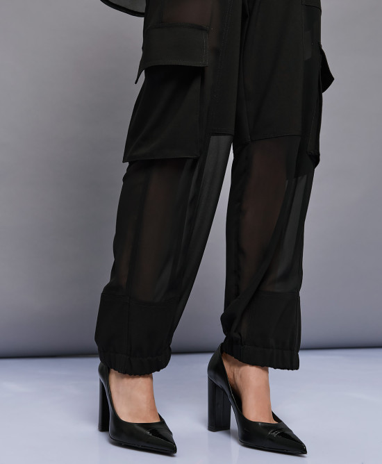 High-waist cargo pants with muslin details. They feature flap pockets at the knee and an elastic waistband with drawstrings. Pair it with the matching shirt from our collection for striking looks.
