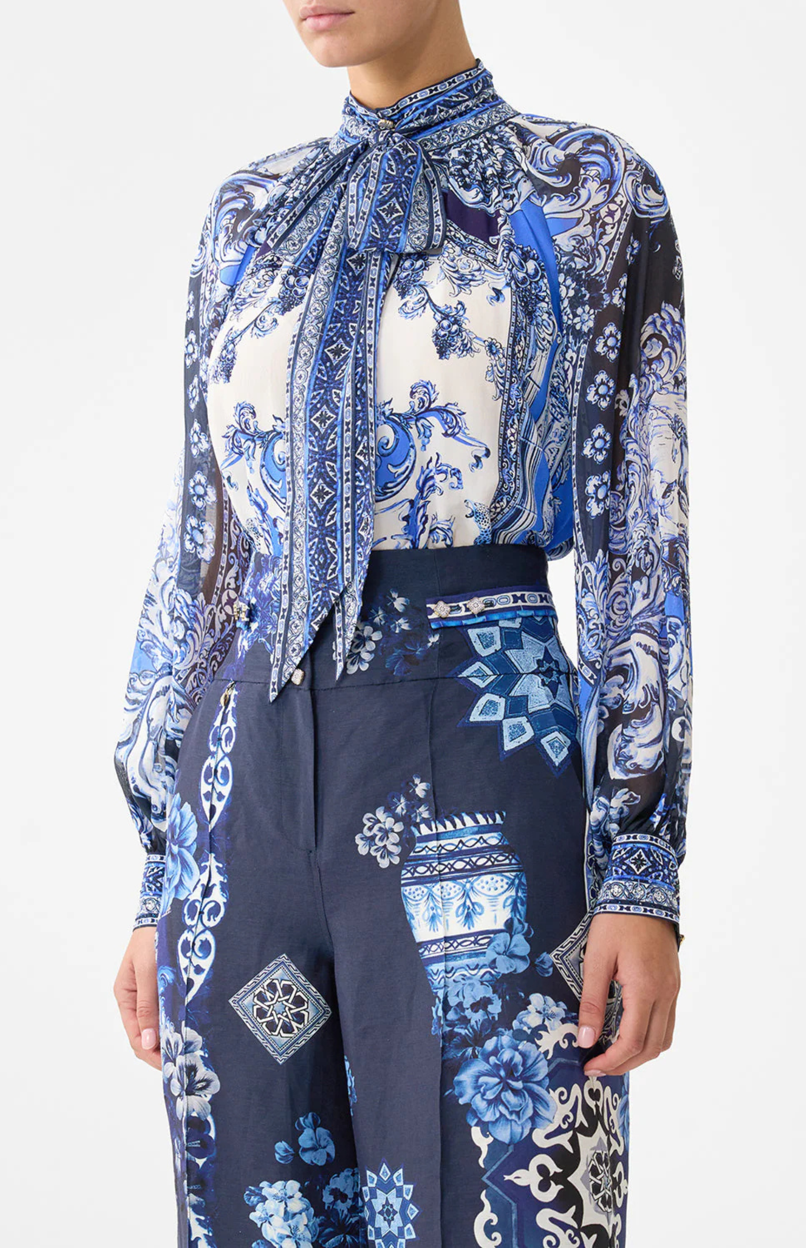 The Valentyna Detachable Pussy Bow Raglan Blouse is a handcrafted silhouette designed by our in-house artisans. Envisioned in an exclusive limited edition print, our silk relaxed blouse features a structured high collar and detachable pussy bow neck tie for versatile styling options. Raglan sleeves fall into voluminous blouson arms, finished with buttoned cuffs for a tailored edge. A gently flared hem offers ease of movement and can be styled tucked or loose.