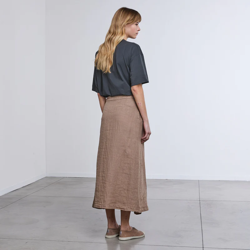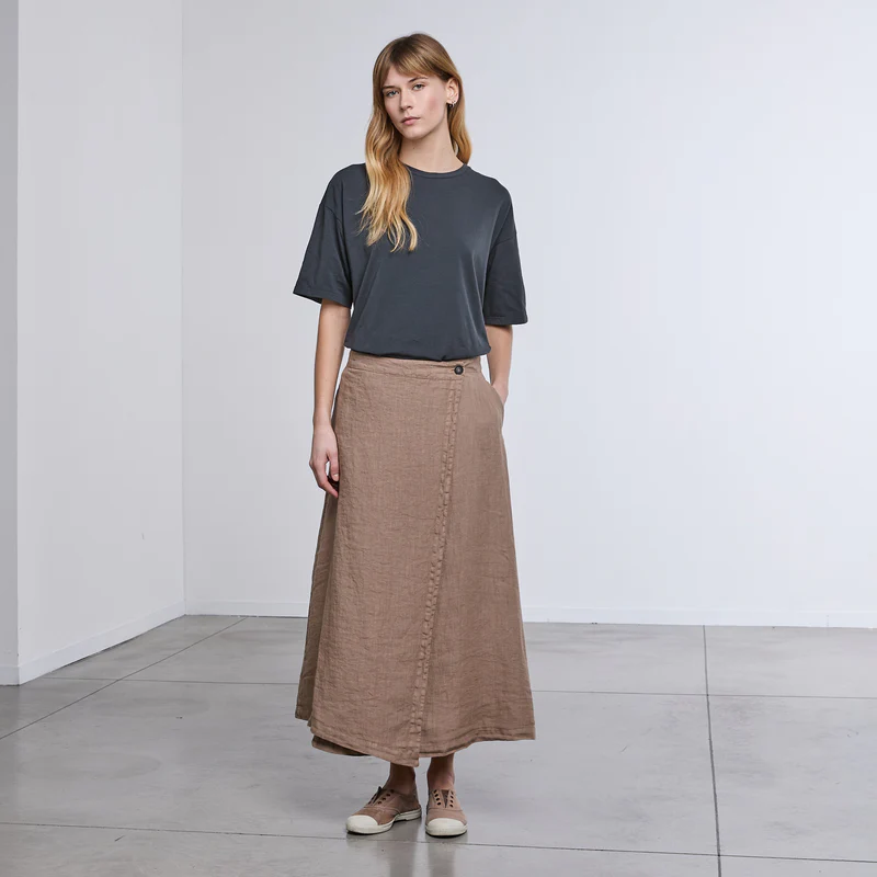 Wrap skirt with adjustable double-button closure and side pockets. Made of 100% linen.
